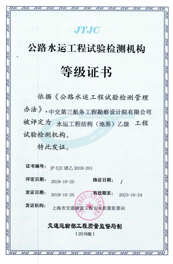 10月25日,公司首次申请公路水运工程试验检测机构综合评定顺利完成全部流程,被评定为水运工程结构(地基)乙级工程试验检测机构,取得水运工程结构(地基)乙级检测资质。